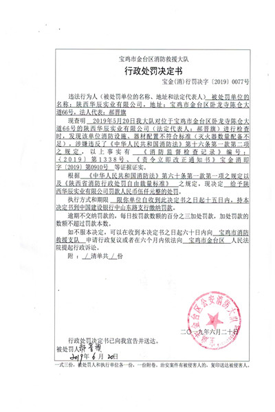 给予陕西华辰实业有限公司罚款人民币伍仟元整的处罚