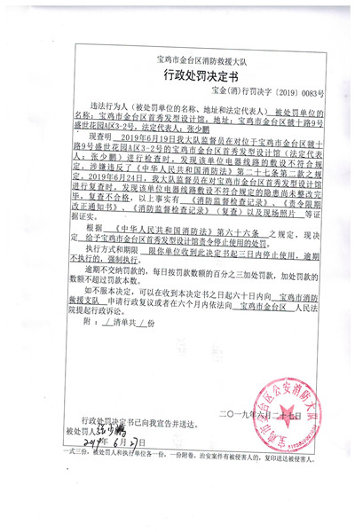 给予宝鸡市金台区首秀发型设计馆责令停止使用的处罚