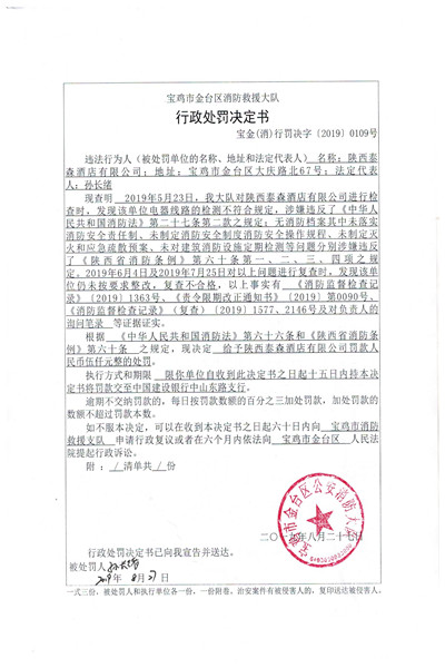 给予陕西泰森酒店有限公司罚款人民币伍仟元整的处罚
