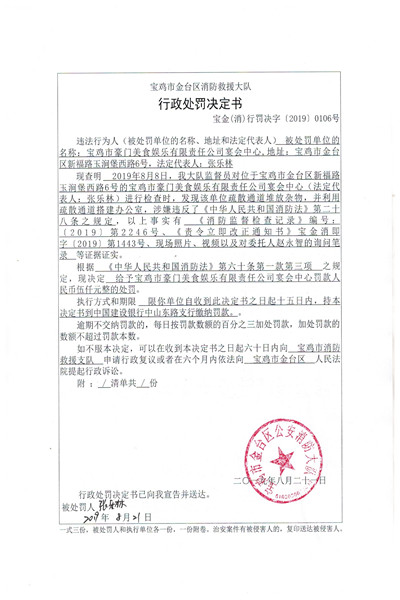 给予宝鸡市豪门美食娱乐有限责任公司宴会中心罚款人民币伍仟元整的处罚