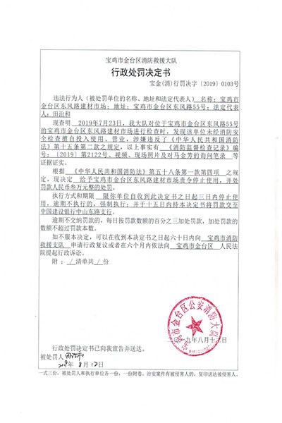 给予宝鸡市金台区东风路建材市场责令停止使用,并处罚款人民币叁万元整的处罚