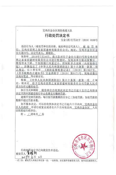 给予宝鸡市居然之家家居建材有限责任公司罚款人民币壹万伍仟元整的处罚