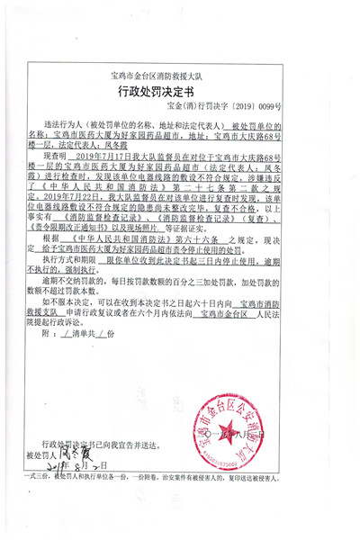 给予宝鸡市医药大厦为好家园药品超市责令停止使用的处罚