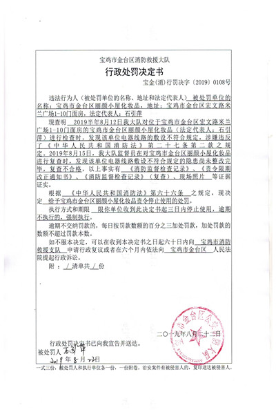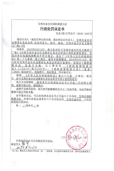 给予宝鸡市金台区这厢有礼美业会所责令停止使用的处罚
