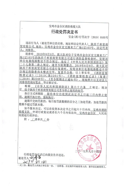 给予陕西千杯窖商贸有限公司责令停止使用的处罚