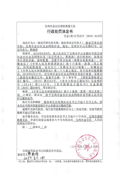 给予宝鸡市金台区虫虫网络沙龙罚款人民币伍