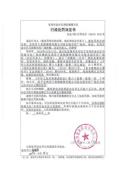给予宝鸡苏宁易购销售有限公司陈仓园市民广场店罚款人民币伍仟元整的处罚