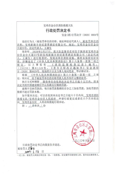 给予宝鸡新旗丰世纪荟萃酒店有限公司罚款人民币叁万元整的处罚