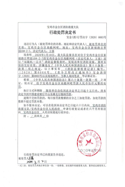 给予宝鸡市金台区尚酷网吧罚款人民币伍仟元整的处罚