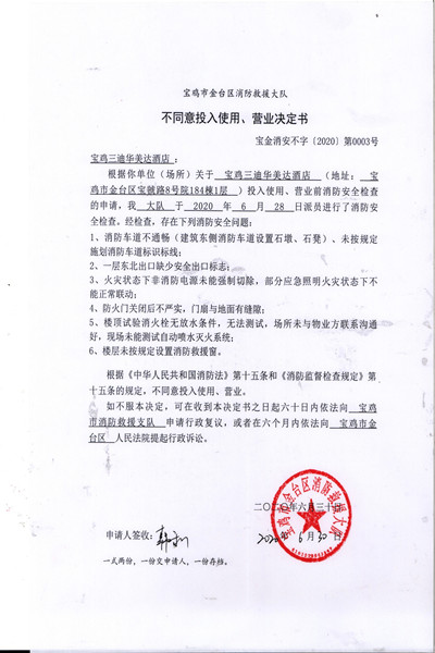不同意投入使用、营业决定书