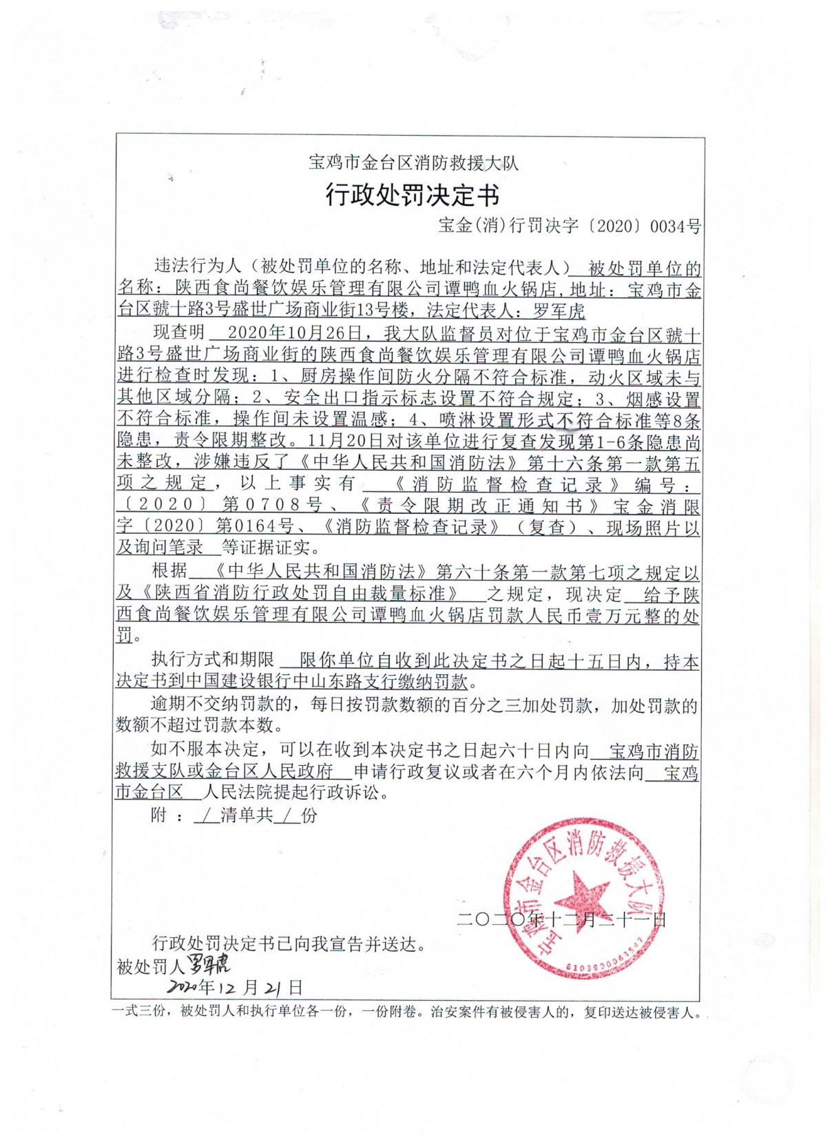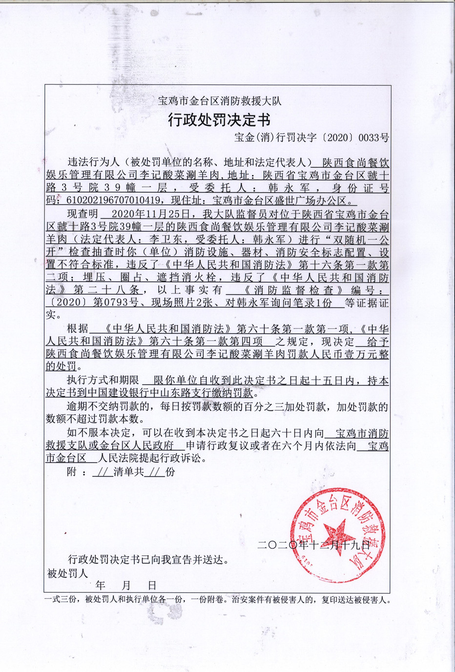 给予陕西食尚餐饮娱乐管理有限公司李记酸菜涮羊肉罚款人民币壹万元整的处罚
