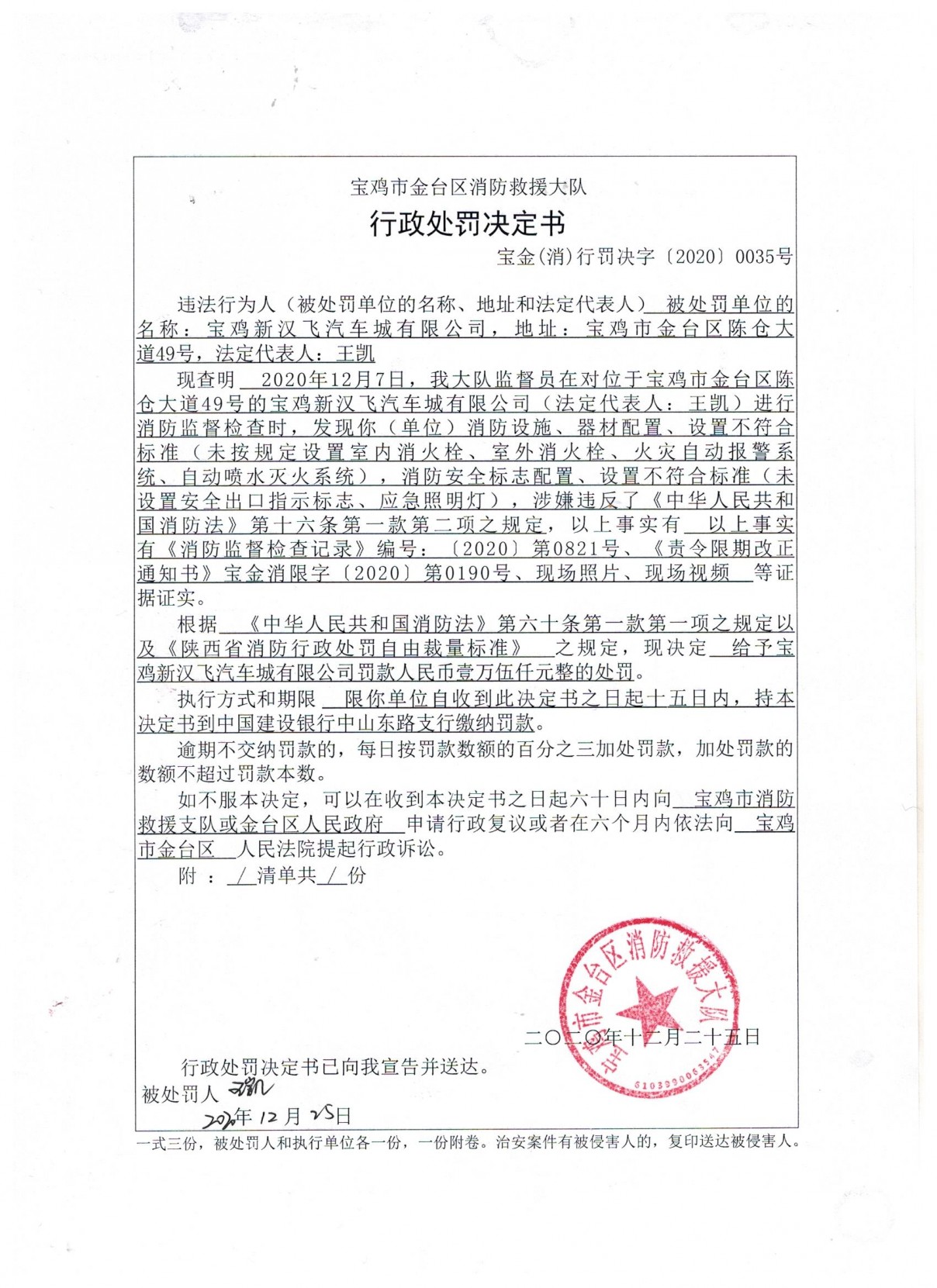 给予宝鸡新汉飞汽车城有限公司罚款人民币壹万伍仟元整的处罚