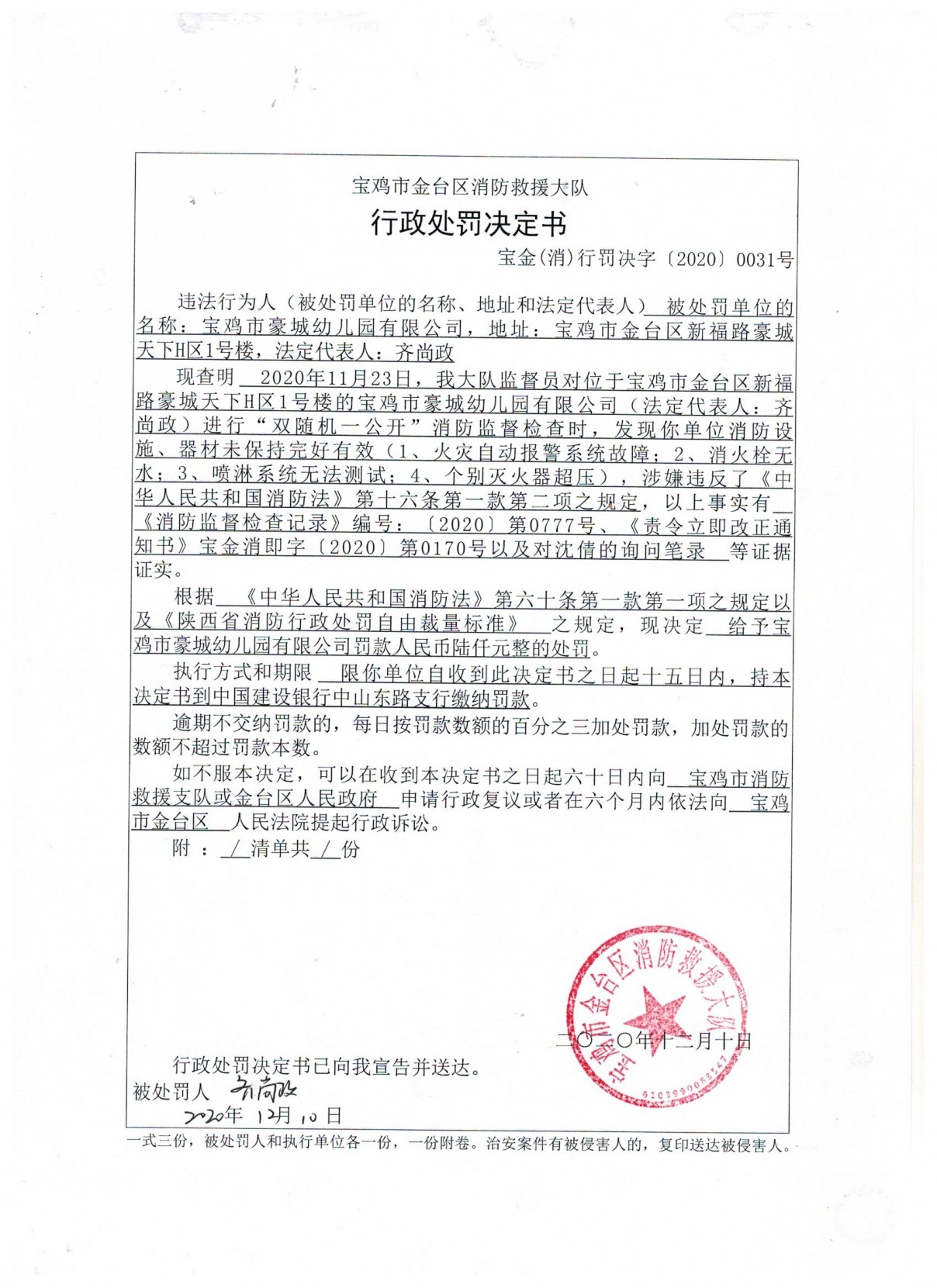 给予宝鸡市豪城幼儿园有限公司罚款人民币陆仟元整的处罚