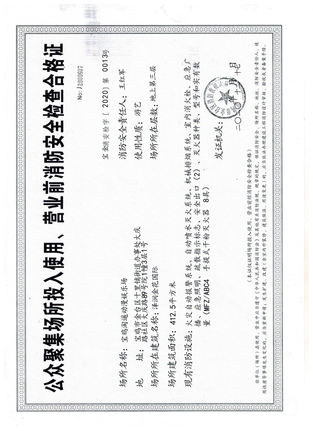 公众聚集场所投入使用、营业前消防安全检查合格证