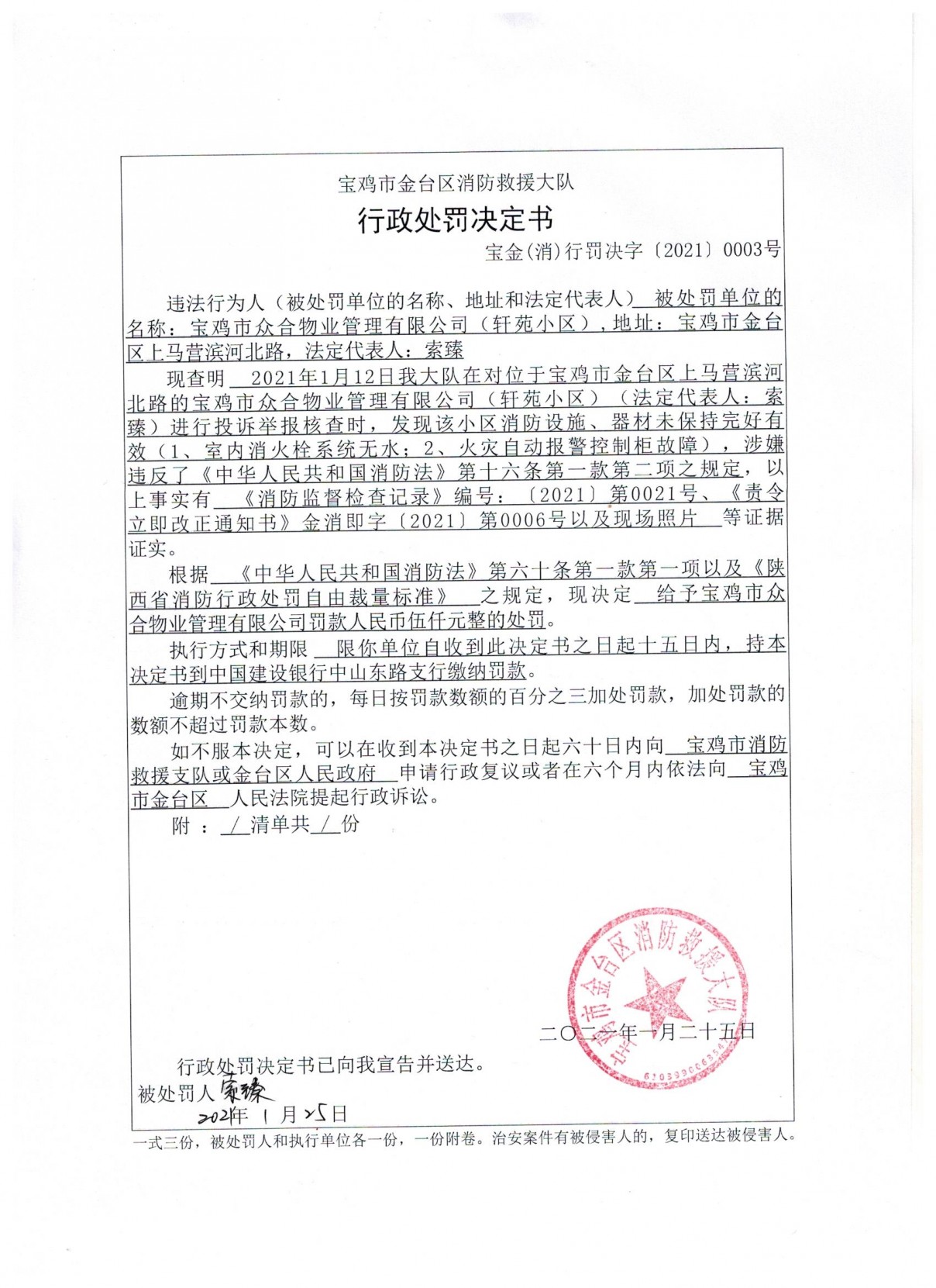 给予宝鸡市众合物业管理有限公司(轩苑小区)罚款人民币伍仟元整的处罚