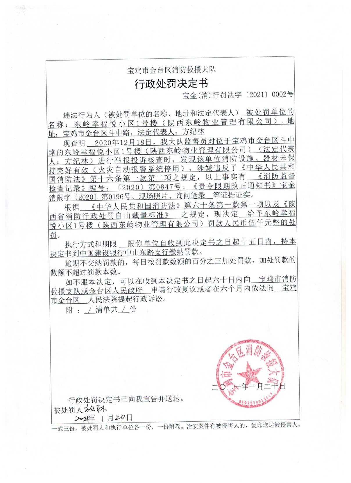 给予东岭幸福悦小区1号楼(陕西东岭物业管理有限公司)罚款人民币伍仟元整的处罚